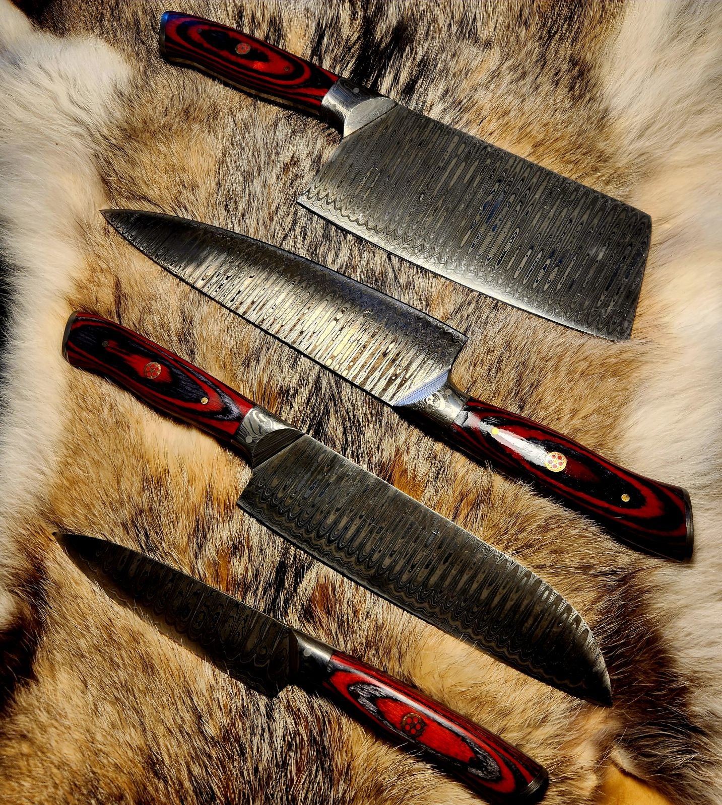 from 9 reviewsGot the purple handled Opulent Chefs Quattro Damascus steel ladder pattern for my wife and my anniversary/mother's day and they are spectacular. We bought a special clear knife block so we can see not only the handles but the patterned steel even while they're put away.